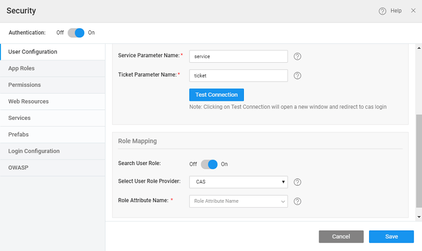 To set up authentication using a Central Authentication Service in WaveMaker apps, enable from the security dialog, choose CAS as the Security Provider.