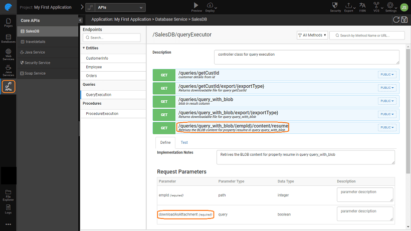 - Separate API will be generated for each Blob field with a Downloadable return type in addition to the executeQueryAPI. The response of the execute query's Blob field's value will contain the absolute URL to the Blob content. It will be null for the rows which do not have a value for that field.