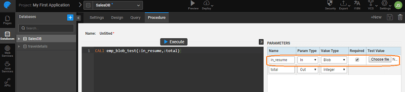 - When param type of Blob is IN in a procedure, then the generated API for such procedure will be accepted as multipart data and the remaining fields are expected as one part with the content type
