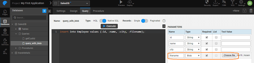 - Each Blob type column supports single file upload, i.e. not as a list. However, there can be multiple Blob params for a single query.
