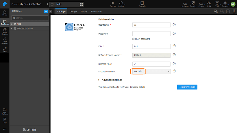 There are cases where the database schema has to be managed outside of the WaveMaker by a DBA or someone else. In such cases, the DB designer should not allow the changes to the Database. To ensure the read-only schema behavior for the imported database, WaveMaker provides an option to import the schema in READ-ONLY mode.