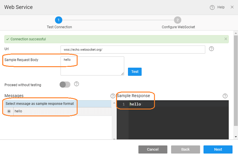 1. Provide the WebSocket service URL, test the connection and import the service.