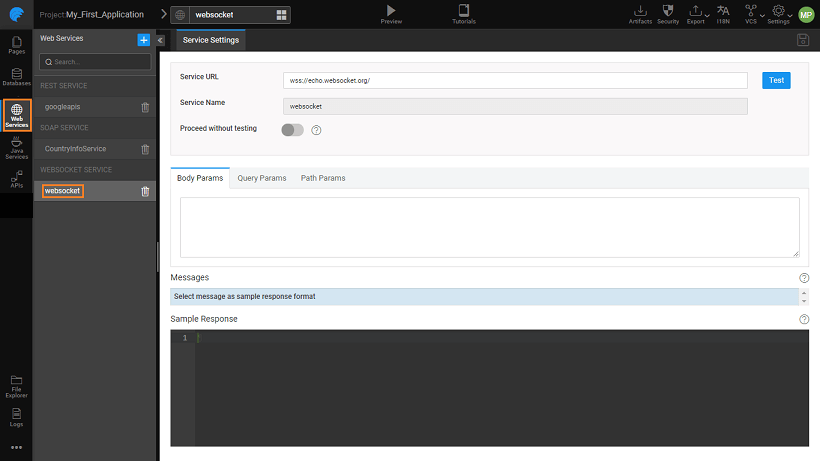 3. WebSocket Service can be further configured by specifying the Query, Path, and Body Parameters as per the app requirements.