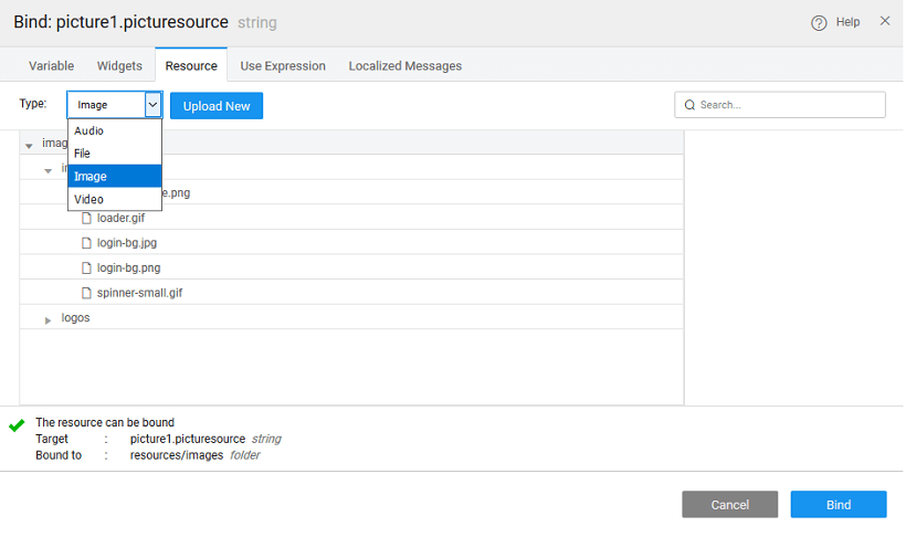1. From the Property panel of the media widget, find the Audio section. Locate the MP3 Source Path option and click the Bind icon represented by a chain-link as shown in the picture below; a Bind modal dialog pops-up.