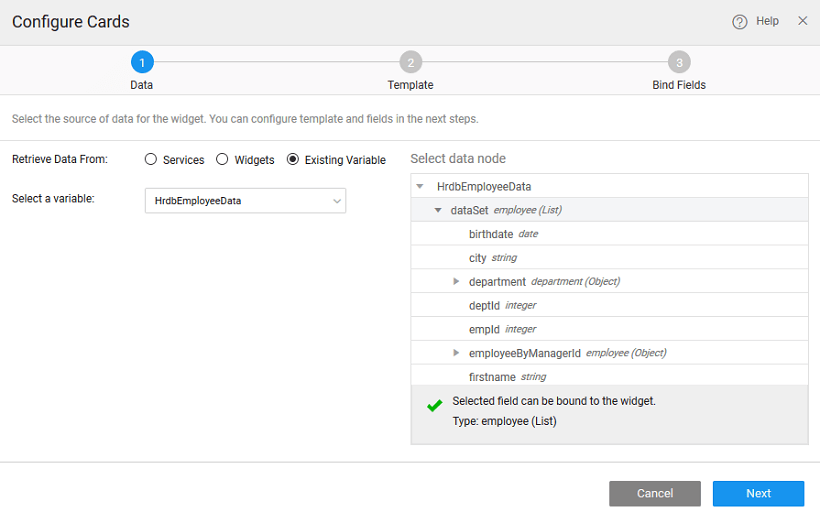 There can be different scenarios to deal with when configuring your Cards Widget with a data source. The data source can be in the form of a service - database, web or Java; or from an another widget on the page.