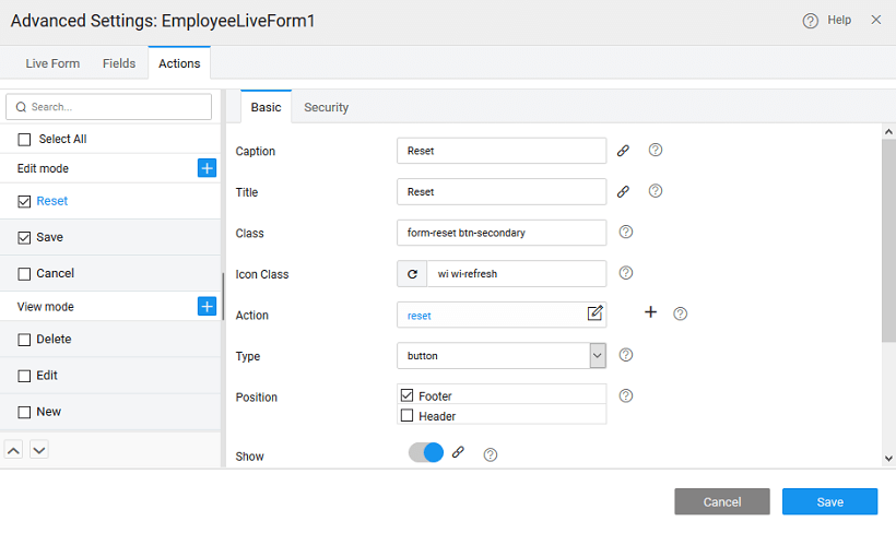 You can define action buttons using the Actions tab. By default, six actions are provided categorized based upon the behavior of the Form. They are: