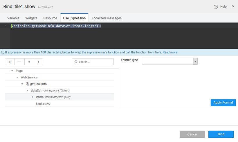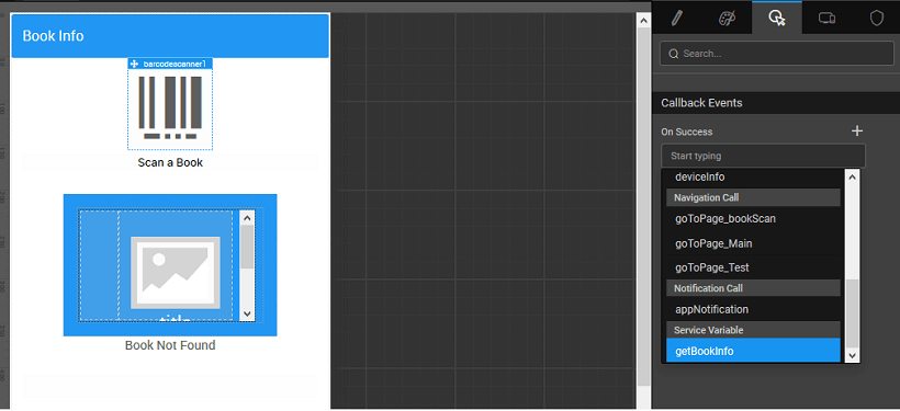 1. Drag and Drop a Label to the page, set Caption property to ‘Book Not found’. Bind the Show property this label such that this label is shown when the Variable does not return any books.