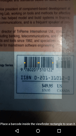 1. Click on ‘scan a book’ button. The camera will open for barcode scanning. Point the camera at any book barcode.