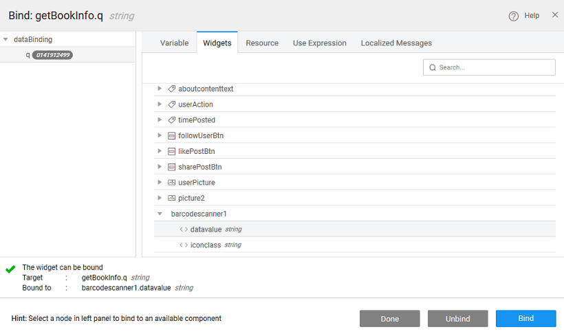 1. Bind the value of q with barcode scanner ‘dataValue’ property and save the variable.