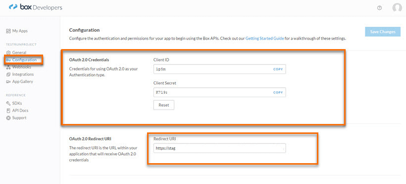 9. Paste the selected callback URL in the redirect URI section of the App in Box, as highlighted in the below figure.