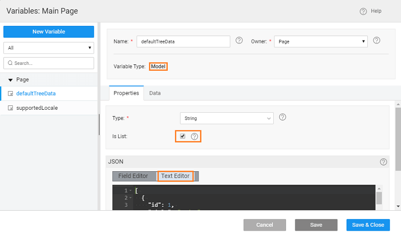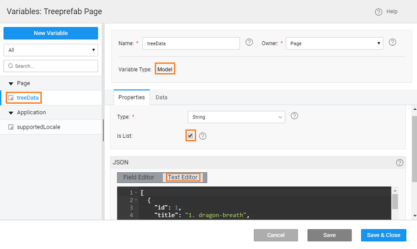 1. From Main Menu use Create option to Create a Static Variable, defaultTreeData, to hold the default tree structure. Select the is List option and enter the Json structure. The structure needs to include id, title, and nodes for subitems.
