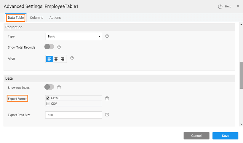 2. From the Data Table tab, scroll down to locate Export Format option and select required format.