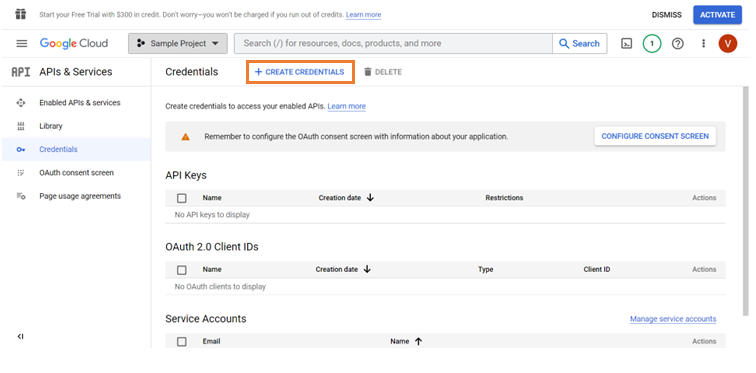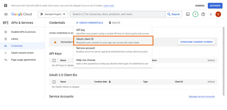 1. Set up user account in the Google Console. This is to create an OAuth application to fetch the Client ID and Client Secret.