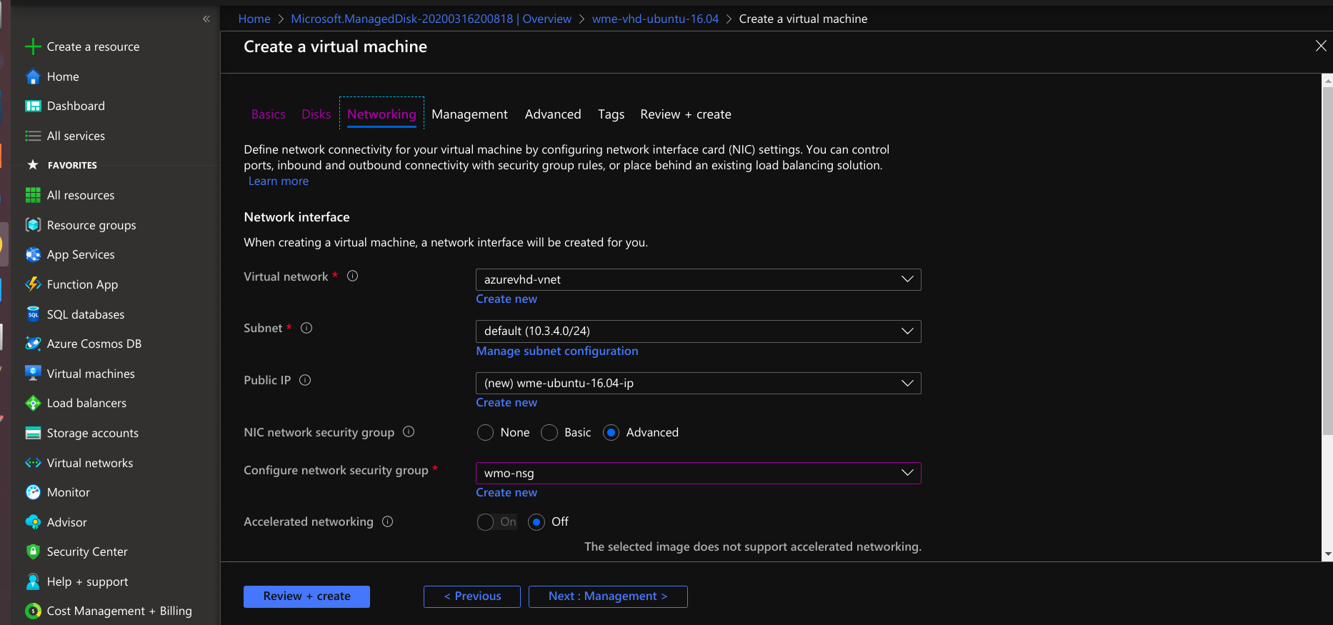 • At Configure network security group select WME-SG-Platform-Public-and-Internal for Platform Virtual Machine and select WME-SG-Workspace-Internal for Studio Workspace/App Deployment Virtual Machine(Workspace Virtual Machine / AppDeployment Virtual Machine).