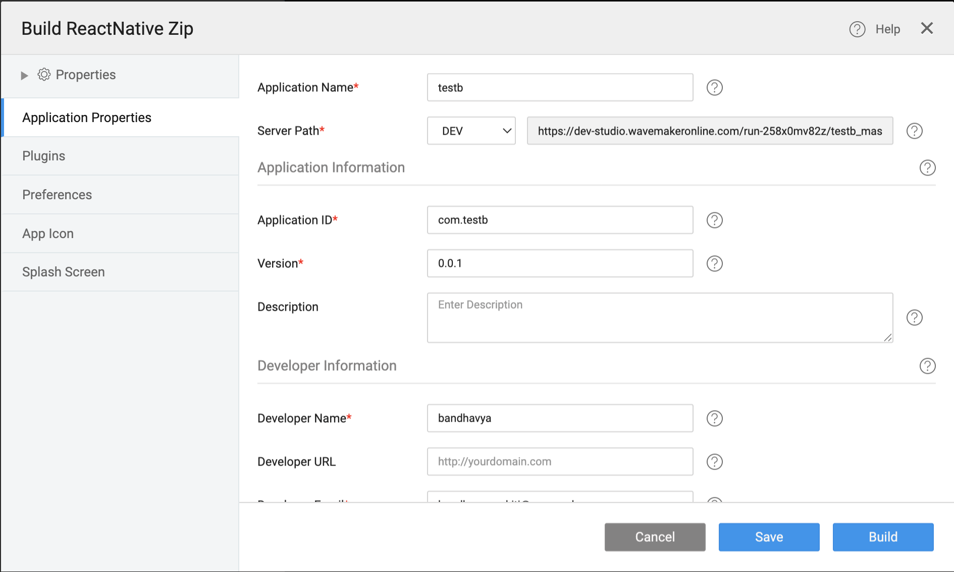 | Server Path | The backend server URL. Dev is used to prepopulate the application preview URL. Custom is used to add the URL of the application which is hosted somewhere else |