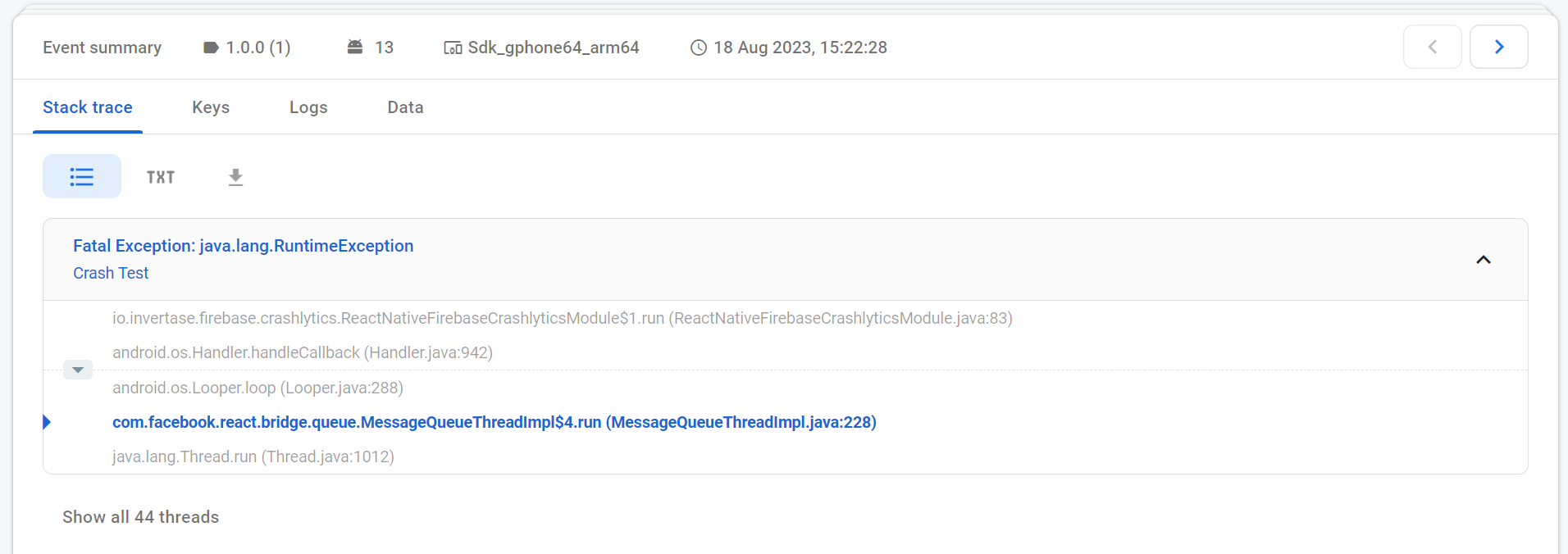 In case of any crash in your WaveMaker application the above configuration would ensure that the crash logs are sent to Crashlytics. You can also check Crashlytics set-up by invoking in-built test function crash() in your application as follows.