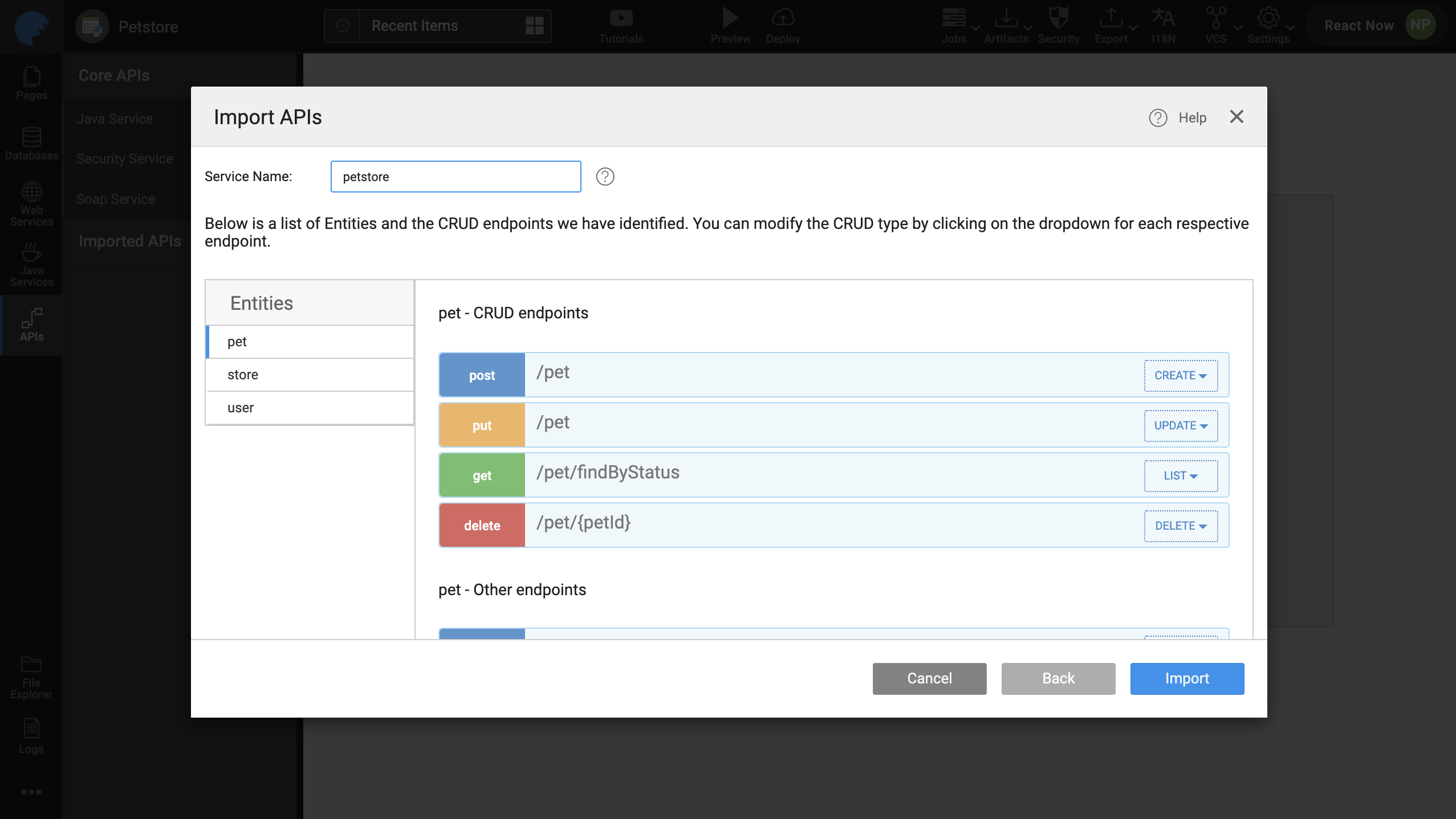 The URL can be imported into WaveMaker Studio as a backend service, allowing developers to create an application faster by focusing on the frontend development.