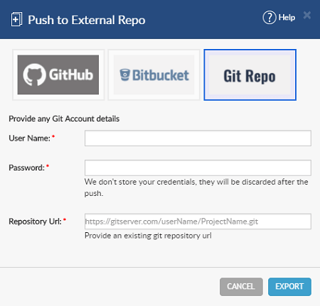 From this release, you can push your app to any Git repository irrespective of the type of the provider. For this to work, you need to provide the URL of the Repository, Username, and Password. For more information, refer #doc.